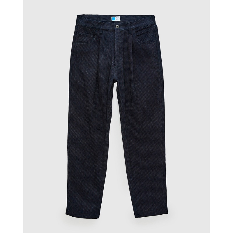 • Cut in a classic five-pocket silhouette, these sashiko pants feature Japan Blues 11oz rope dyed sashiko fabric. Inspired by “hikeshi banten” or traditional Japanese firefighter uniforms, Japan Blue’s 11oz sashiko fabric is woven with thick sashiko threads on a sturdy cotton base. The fabric is rope dyed indigo for a rich hue that will continue to fade with time. Japan Blue’s Wide Tapered fit features a high rise, roomy thigh, and slight taper throughout the leg.