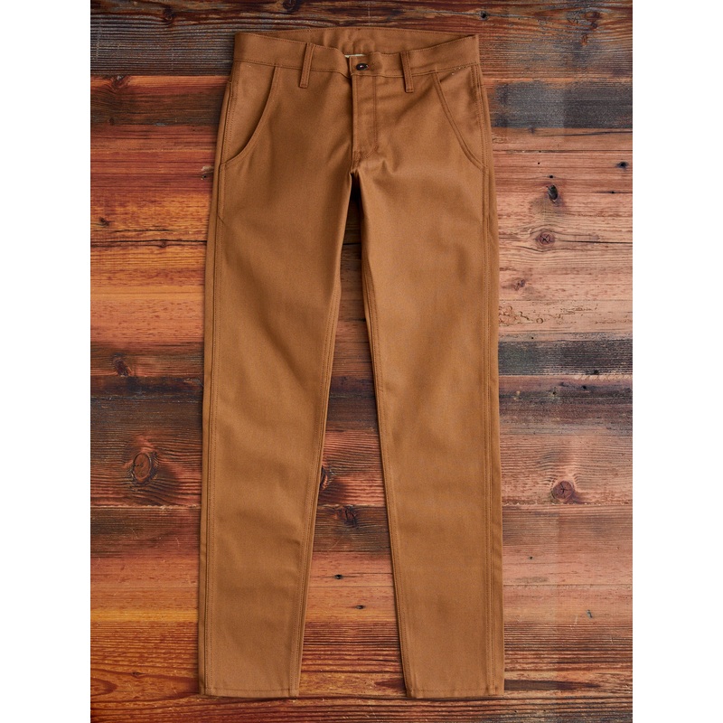 • The Flight Trousers from Railcar Fine Goods are a US-made slant pocket worktrouser sewn using American made fabrics, labels, thread, and hardware. Railcar’s 12oz duck canvas is a breathablemid-weight fabric with a smooth surface texture and tough durability. The pants are fitted with Railcar’s signature tucked waistband chain stitching to prevent unraveling, two-piece waistband, shell edge interior fly pieces, and a custom brandedcanvas patch. Cut in the brand’s slim tapered fit with a medium rise, room in the thigh, and strong taper from the knee down.