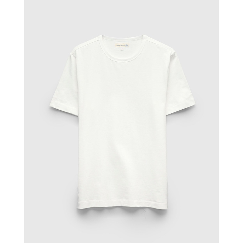 • Crafted in Germany on Merz b. Schwanens mid-century jersey knitting machine from the 1960s, the 2M15 shirt is the brands vintage-knit medium weight tee. As an alternative to the iconic 215, this version features a slightly lighter weight and is constructed with side seams to better follow the bodys natural lines. Unlike modern machines that use more needles to produce finer jerseys, this vintage circular knitting machine uses a wide needle spacing, a 26″ (66cm) diameter, and a two-thread process to create a unique texture. The result is a distinct construction that sets it apart from traditional knits. We recommend sizing up to account for shrinkage.