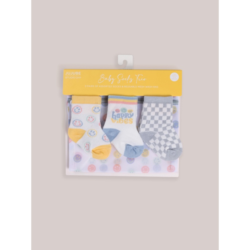 For babies 3 to 12 months old, the Baby Socks Trio sets by JuJuBe Studio Oh! are designed with adorable artwork in calming color palettes. Each trio features three different designs and comes with a coordinating mesh wash bag so you will never lose a tiny