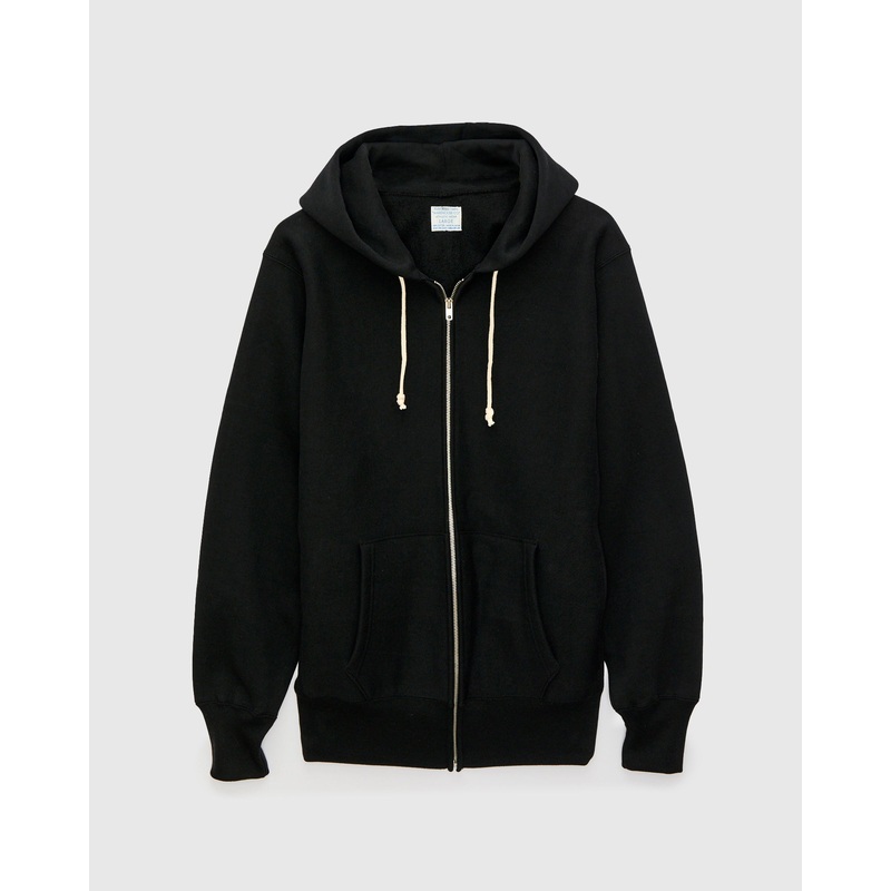 • The Lot 487 Zip Hoodie from Warehouse is a faithful reproduction of midcentury athletic knitwear. Referencing 1960s American reverse weave sweatshirts, Warehouse’s 487 fabric is made from heavyweight loopwheel fabric knit slowly at a rate of just one meter per hour, giving it a soft, lofty, and durable feel. True to period construction, the hoodie features ribbed side panels for increased range of motion and to prevent fabric twist during washing. Designed to minimize shrinkage, reverse weave fabrics are knit horizontally rather than vertically. This construction, combined with ribbed side paneling, increases durability and helps maintain the garments shape over time.