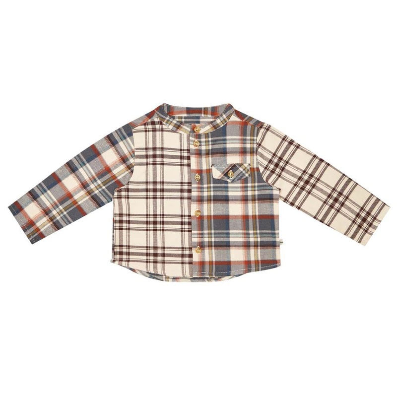 Baby’s long sleeved straight fit shirt, with false patch pocket, in patchwork print.