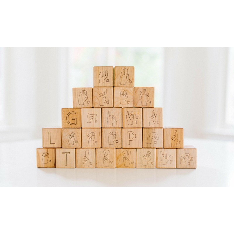 American Sign Language blocks are here! This gorgeous set of 26 Mapleblocks with ALS signs on one side and capital letters on the back is sure to become a long lasting family heirloom and fun for any child. Made from maplehardwood, this set of 26 blocks ar