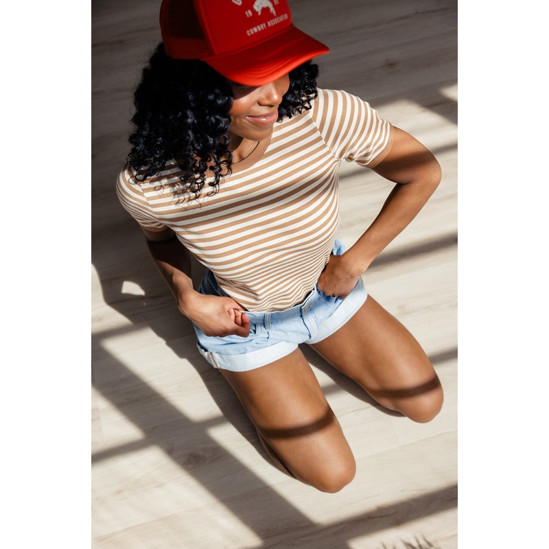 Featuring a classic crew neckline and a relaxed fit, this soft cotton t-shirt blends comfort with effortless style. The timeless stripe pattern makes it easy to pair with your favorite denim, shorts, or layered under overalls for a casual, laid-back vibe. A go-to essential for any season.