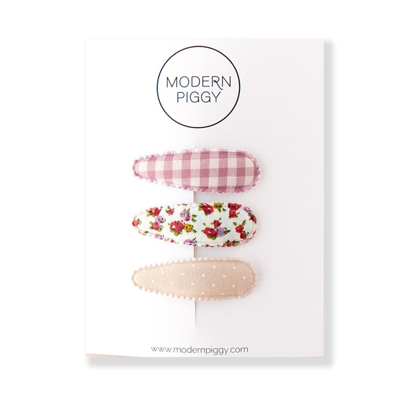 Oursnap clips are a fun way tojazz up even the simplest of hair styles. For girls of all ages!Each snap clip measures approximately 2.5" x .75".We look forward to seeing you wearing #modernpiggy.*Due to the nature of our handmade bows and pattern on the fa