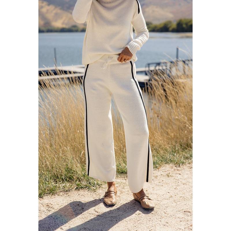 These white wide leg pants feature contrast side seams, a cozy fit, and a functional drawstring waist. Pair with the matching sweater or branch out and pair with your favorite graphic tees for a cute and comfy look!// paired with the another avenue contras