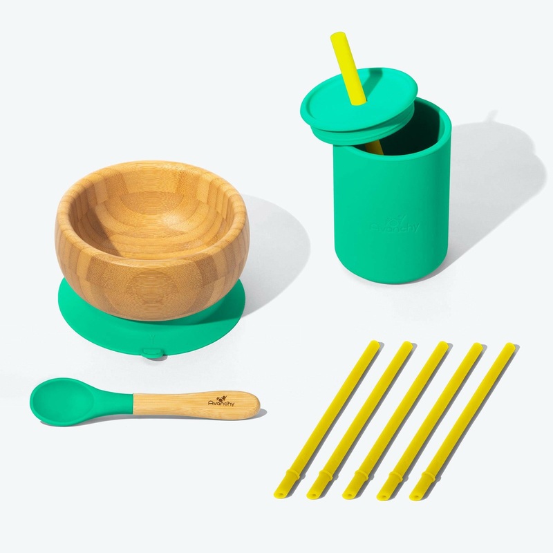 Introducing the Avanchy Mealtime Magic Set, a perfect set designed to make mealtime enjoyable and hassle-free for parents and their little ones. This all-in-one package includes a Bamboo Bowl with Suction, an 8oz Medium Silicone Cup, and a pack of 5 matching straws.