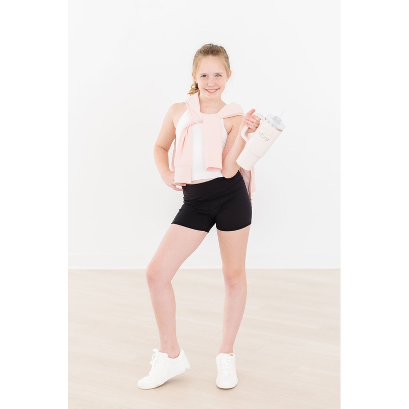 Its finally here! An active line made for dance, cheer, yoga workouts or just lounging at home. She will love the little details of this shorty short like the pocket. The line is made to mix and match or buy all 3 pieces in her favorite color in the jacket