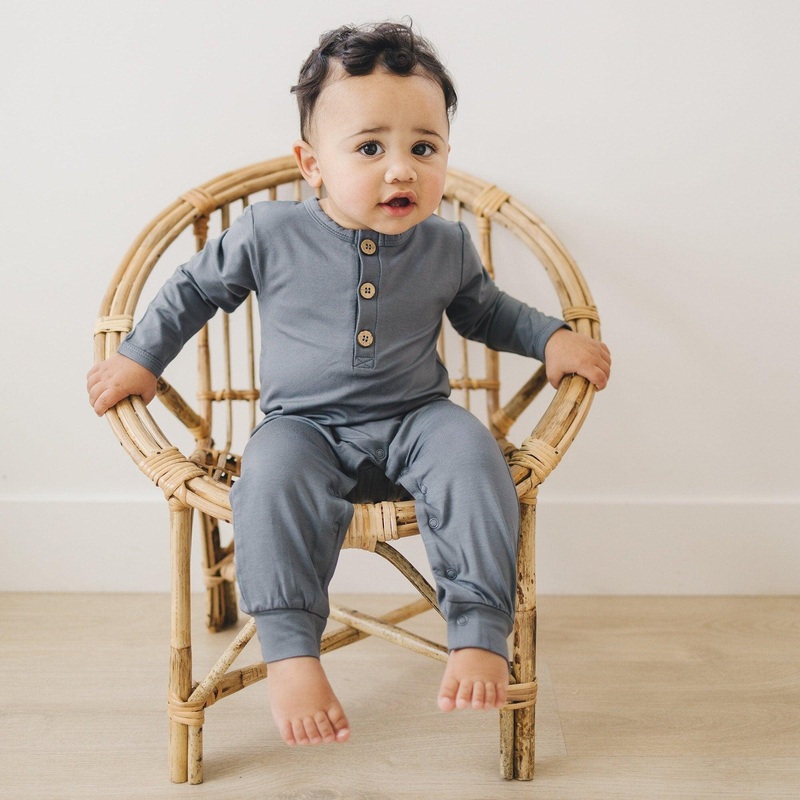 Introducing our Long-Sleeved Bamboo Henley Romper, where comfort meets style. Available in six colors and sizes 0-3 to 18-24 months, this romper is crafted from 94% bamboo viscose and 6% spandex. It runs true to size, featuring a three-button Henley neckli