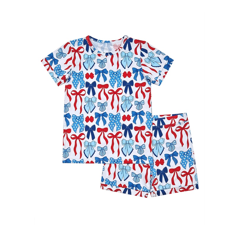 Celebrate in style with the Bamboo Shorts Set | Red-White & Bows!Featuring a sweet and festive print of red, white, and blue bows, this two-piece set is perfect for warm-weather celebrations and everyday play. Crafted from our signature buttery-soft bamboo