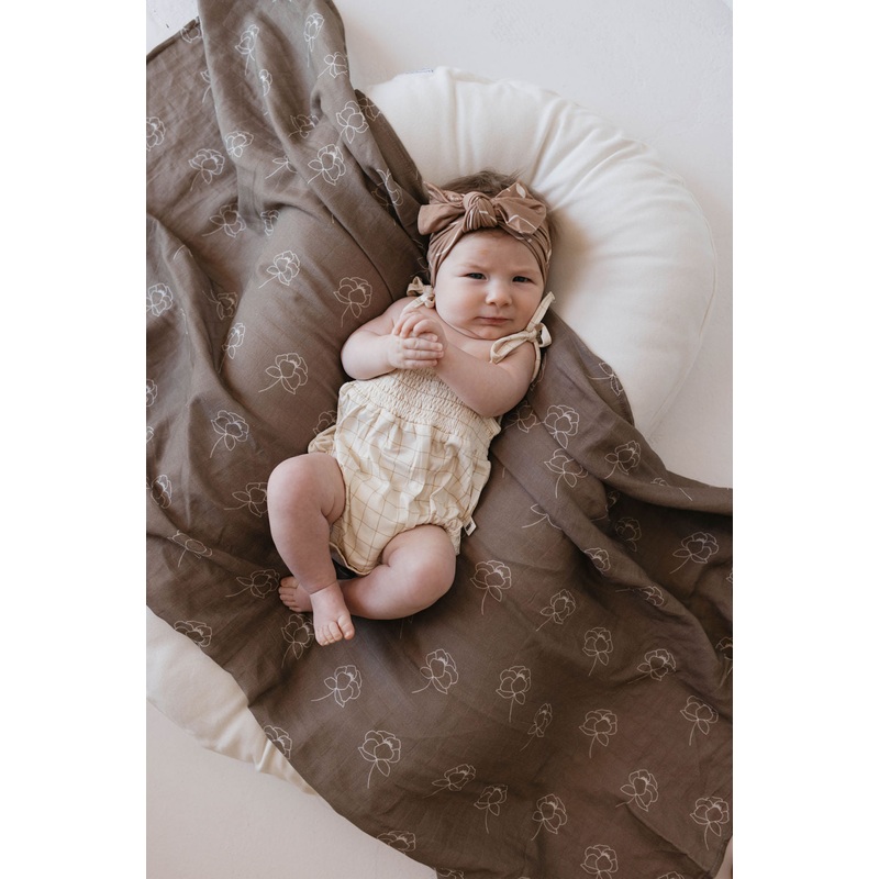 Introducing our Bamboo Tie Top Romper in Golden Grid Made with adjustable tie shoulder straps and bamboo fabric, this romper is both stylish and comfortable for your little one. The convenient snaps make diaper changes a breeze, and the cream fabric with g