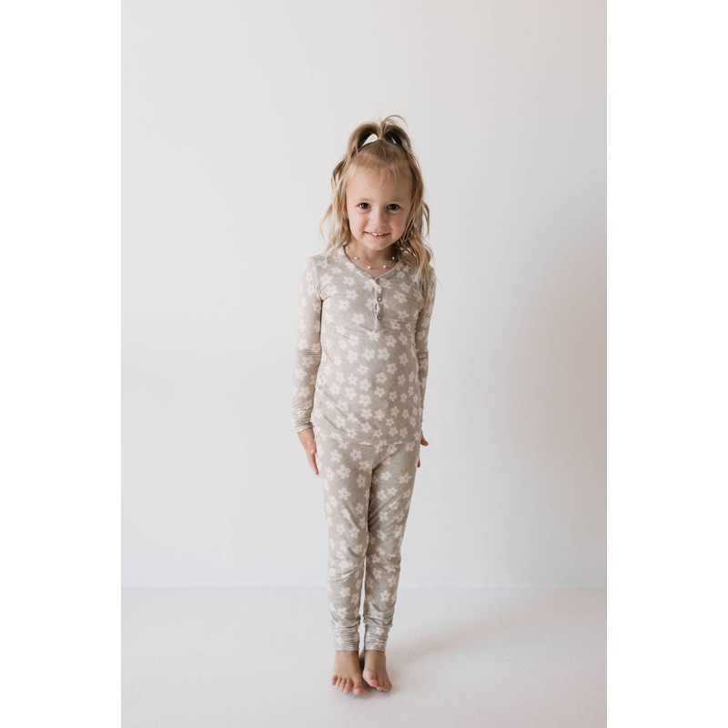 Experience the ultimate comfort and breathability with our Bamboo Two Piece Pajamas in French Gray Floral. Made from the finest bamboo fabric, these pajamas will keep your child cool and cozy all night long. The subtle gray green tone and delicate cream fl