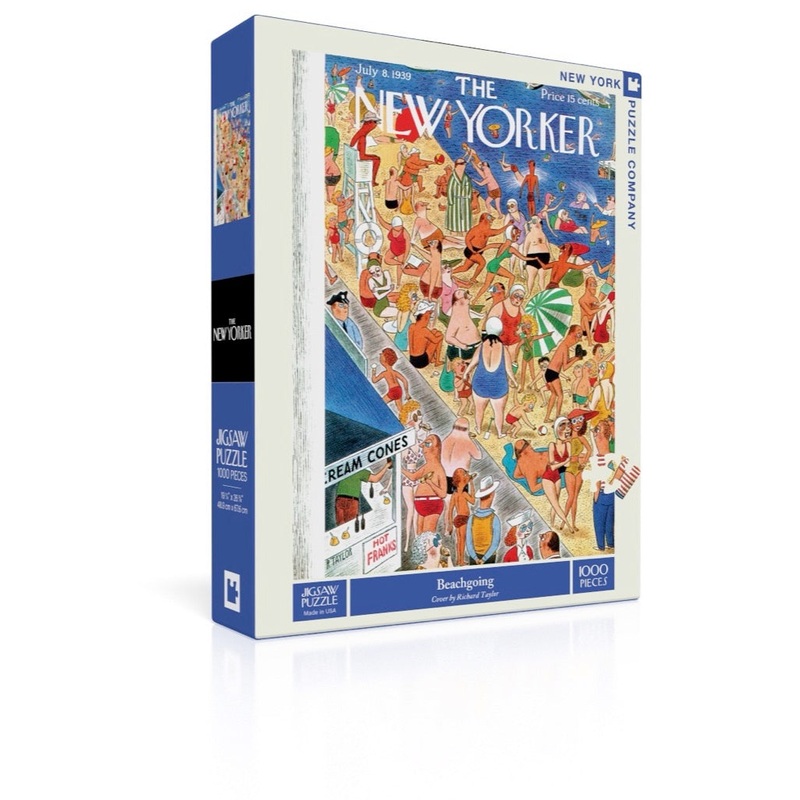 Enjoy a busy day at the beach with New York Puzzle Companys challenging 1000 piece puzzle with exclusive art from The New Yorker Magazine. An exuberant crowd is doing everything under the sun; tanning, chatting, eating, splashing, swimming, and having a general good ol’ time. This New Yorker cover is from the July 8, 1939 with art by Richard Taylor. The covers of The New Yorker have entertained and enlightened the magazine’s readers for nearly a century. With unmatched visual sophistication and wit, they let no subject escape their scrutiny. A roster of extraordinary artists continues to create indelible images that are infinitely varied in style and tone, whether whimsical, provocative, serene, or laugh-out-loud funny. The New Yorker’s covers are always the talk of the town and make for an exciting jigsaw puzzle experience.