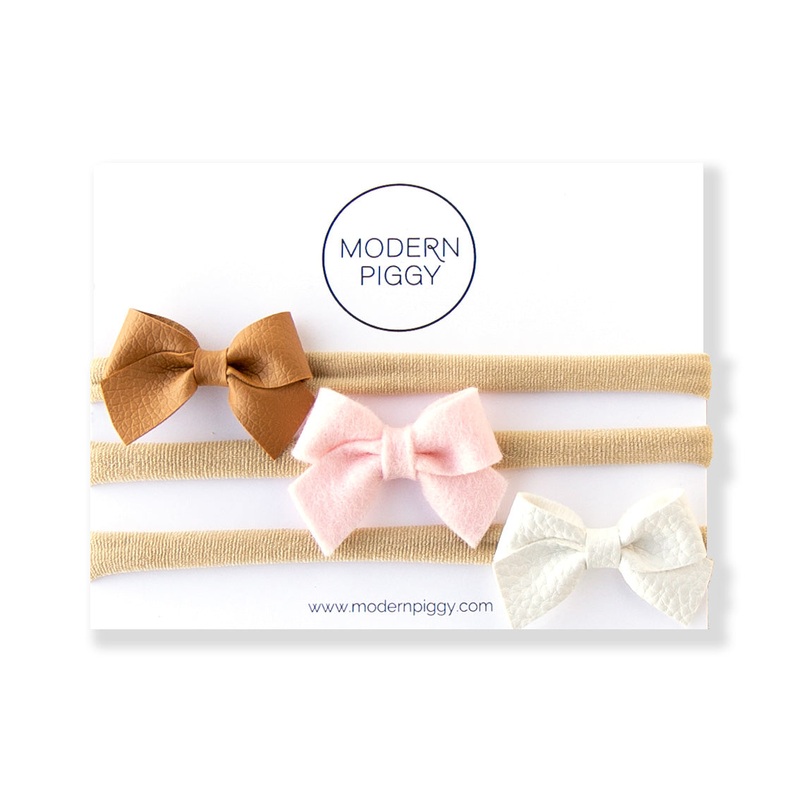 A set ofthree baby bows.Save 10% when you buy in a set!A sweet and simplebow made out of a high-quality felt or faux leather and are the perfect size for those tiny newborns.Each bow measures approximately 2" x 1 and is handmade with love.Two different sty