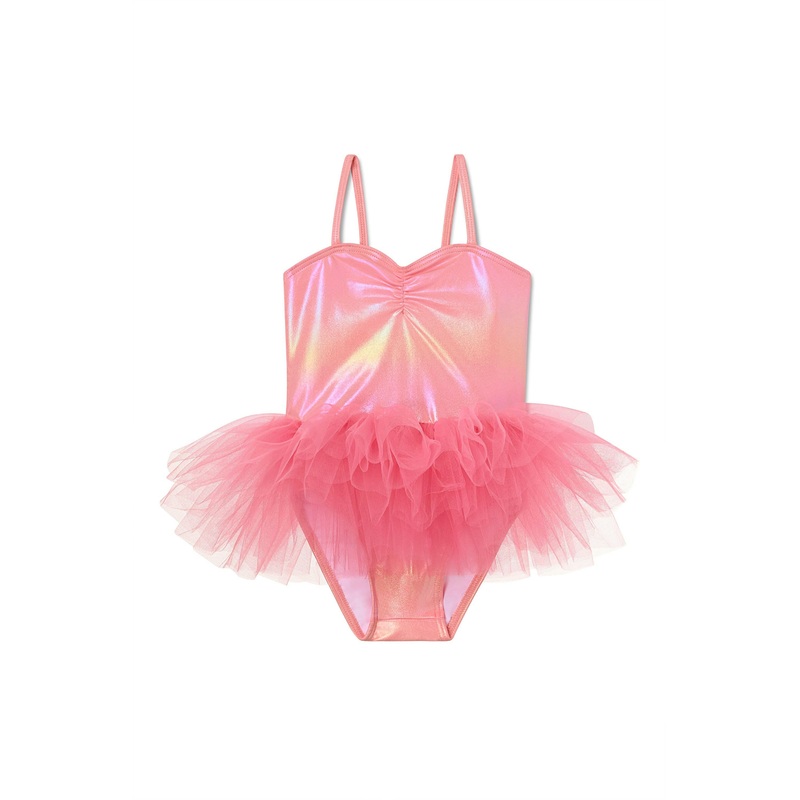 Shimmer and Shine, its Swimsuit Time! The metallic Betsy bathing suit features a ruched bodice and attached tutu skirt.