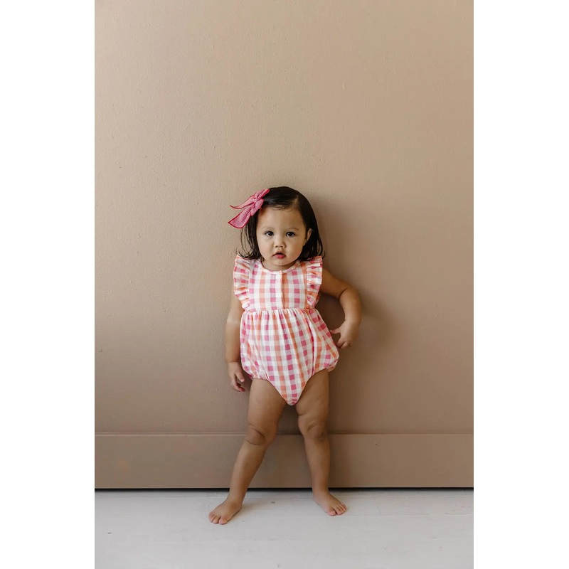 A fun and easy baby romper in our signature extra soft and stretchy fabric with ruffled sleeves, three button detail in front and three snap closure for easy changes!Featuring our Ollie Jay custom Bright Gingham all over print by Hey Cute Design95% Cotton