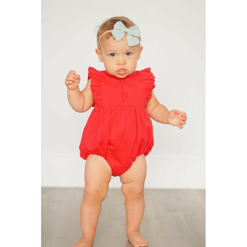 A fun and easy baby romper in our signature extra soft and stretchy fabric with ruffled sleeves, three button detail in front and three snap closure for easy changes!Featuring our Ollie Jay Scarlet solid color 95% Cotton 5% SpandexWash cold with like color