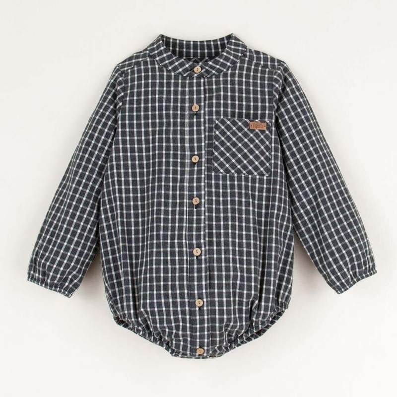 Shirt-style romper suit with pocket and Mandarin collar. Wooden button opening on the front and crotch. Elasticated cuffs.