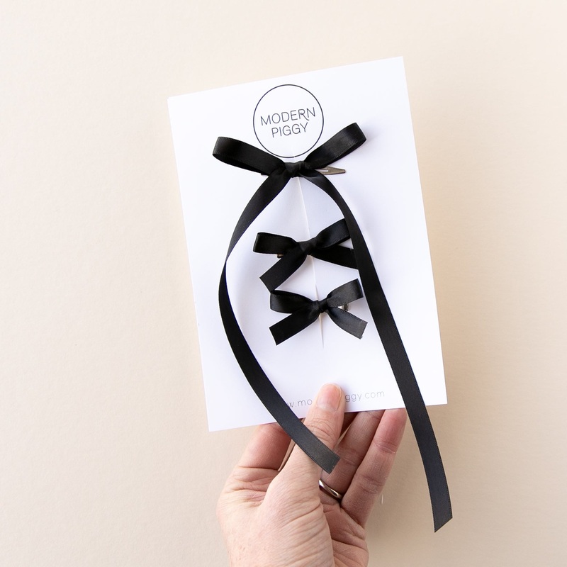 Each pack includes:- Statement Ribbon Bow (3" x 8)- Mini Ribbon Bow Set (2" x 1" each)Sweet and simple hand-tied bows made out of a high-quality satin ribbon.All bows on alligator clips. Best option for your older babes. The clip can easily be rotated to b