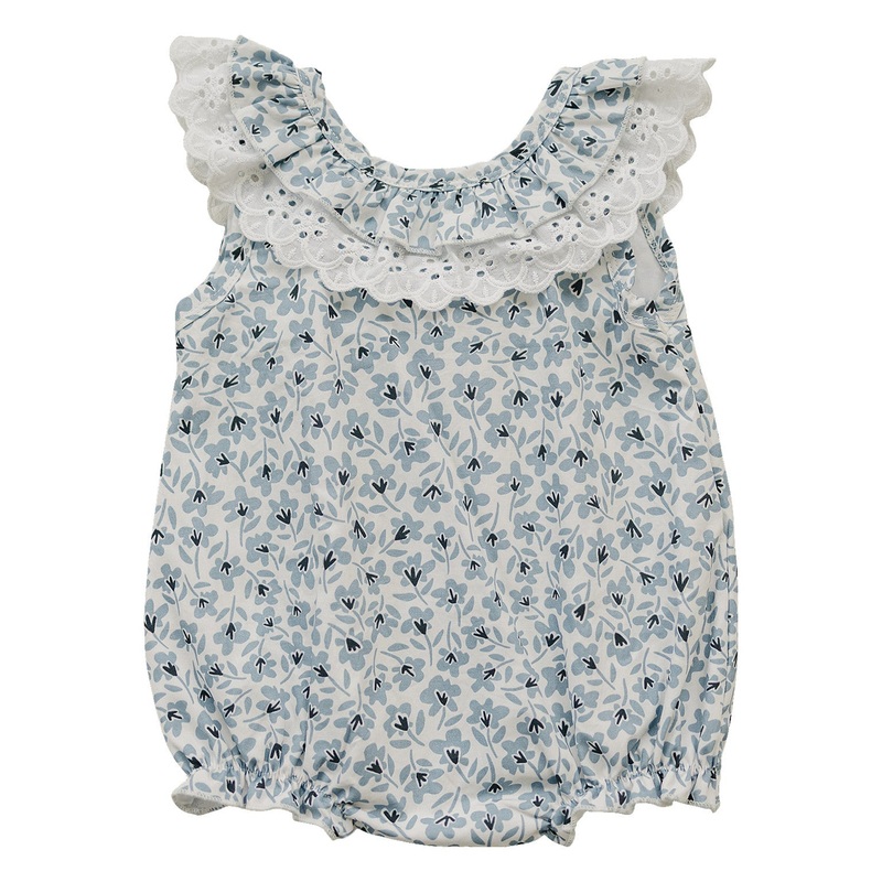 Let your little one bloom in our charming Blue Blossom Bubble Romper, designed with delicate floral details and soft, breathable fabric for all-day comfort. This timeless piece features a vintage-inspired eyelet lace trim along the neckline and flutter sleeves that add just the right touch of sweetness. A darling V-back finished with a soft bow adds an extra dose of charm from every angle.