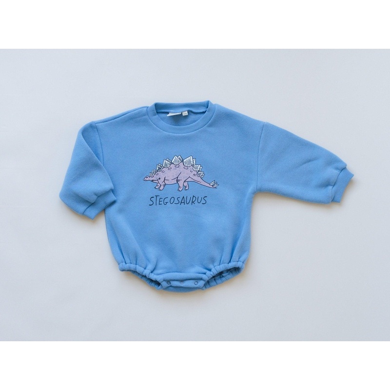 Stegosaurus graphic oversized sweatshirt romper with snaps at crotch. Fleece sweatshirt material.