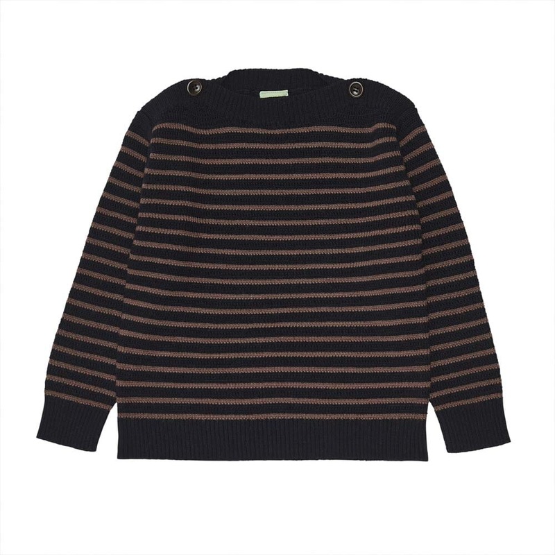 The blouse has a regular fit and is knitted in a classic yarn-dyed stripe. The buttons are made from corozo nut and are entirely biodegradable.