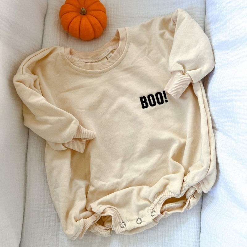 BOO! embroidered oversized sweatshirt romper with snaps at crotch. Lightweight terry material.