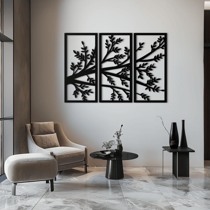 Bring the elegance of nature into your home with this Branch Metal Wall Art, crafted from 1.5 millimeter premium steel and electrostatically painted for a durable, rust-resistant finish. This three-panel steel artwork features a beautifully detailed branch with leaves, adding a modern yet organic touch to any space.