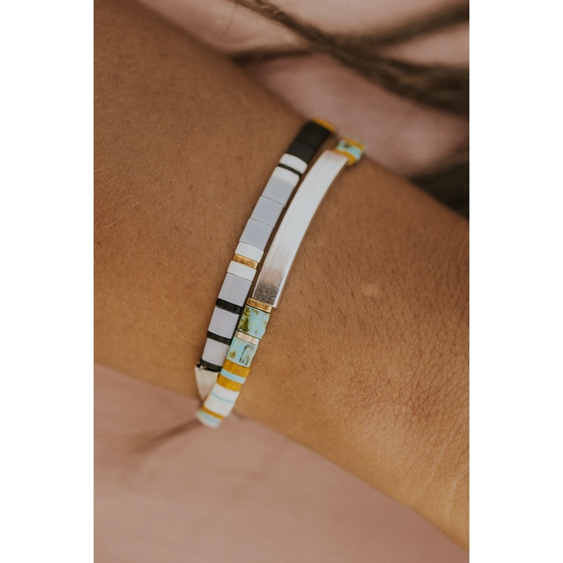 Share good intentions with this sleek Japanese glass Miyuki bracelet. Playful combinations of matte and pearlescentbeads are strung up with an empowering message. Featuring5mm width Japanese glass Miyuki beads, stretch cord, leather 'Brave' keychain & hang
