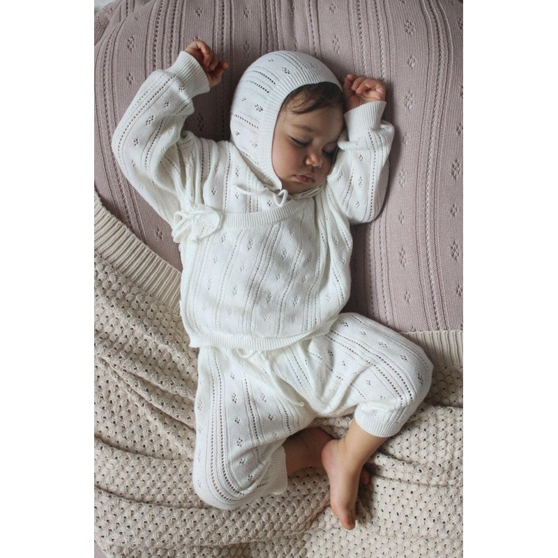 Say hello to perfection! Our Bring Me Home bundle set is perfect, sweet and cozy. Included in the bundle is a pointelle kimono top, pants, and bonnet. As a great gift, we know you will love this set as much as we do. 100% Organic CottonElastic at waist.Mat