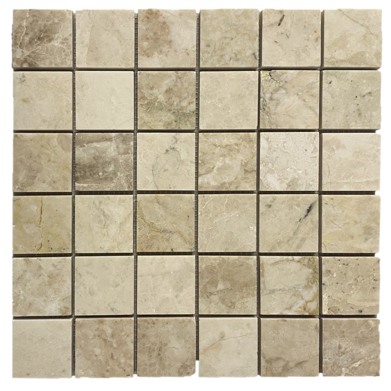 Bristol Cappuccino 2"x2" on 12" x 12" Mesh Polished Marble Mosaic Tile is produced from Light Brown marble which has a light beige background and some dark brown veining. Lighter and darker tones of marble mosaics creates a contrast. Predominantly beige an