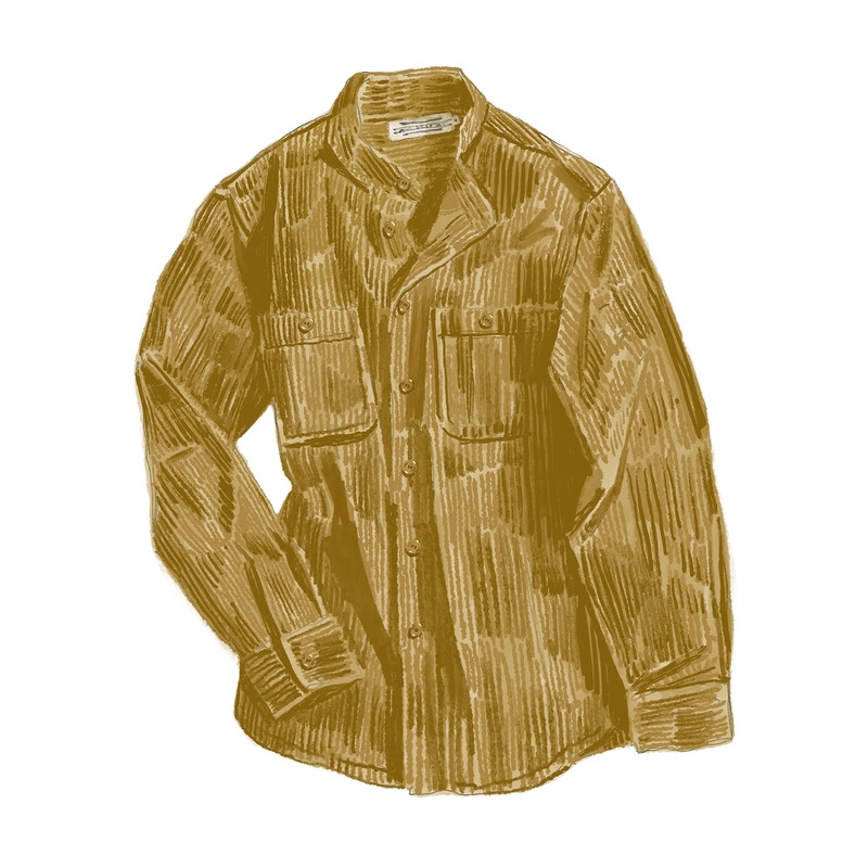 British Corduroy Shirt Jacket (No. 6926). Heavyweight eight-wale corduroy woven in UK by Brisbane Moss. Corozo-textured workwear buttons. Classic band collar construction. Fits like overshirt. Double patch chest pockets and vintage style bound sleeve plack