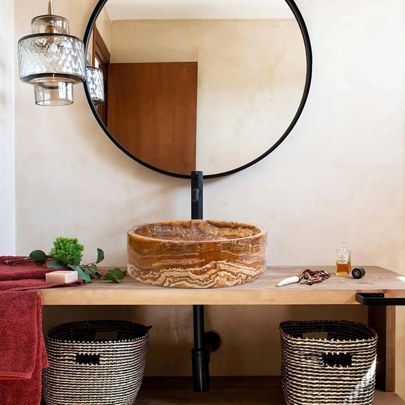 Brown Onyx Translucent Natural Stone Above Vanity Bathroom Sink Polished (D)16" (H)5"- Translucent Vessel Sink Handcrafted in Turkey. Hand-crafted to be used in Bathrooms Above Counter or Under-mount.Custom sizes, shapes and finishes are available. Just co