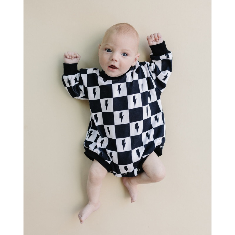 Introducing the Charcoal Bolts bubble rompera perfect blend of vintage charm and modern style. The dusty black printed lightning bolts add a cool, edgy touch to this long sleeve romper. Crafted from a soft, stretchy fabric of 95% cotton and 5% spandex, it