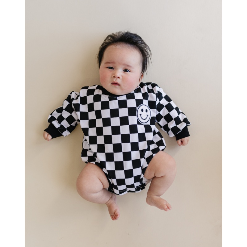 Black checks never looked this adorable - meet your new favorite romper.This long sleeve bubble romper is crafted with the most comfortableand soft cotton fabric. Elastic leg openings & bottom snap closures make it simple to dress & undress. It's sure to b