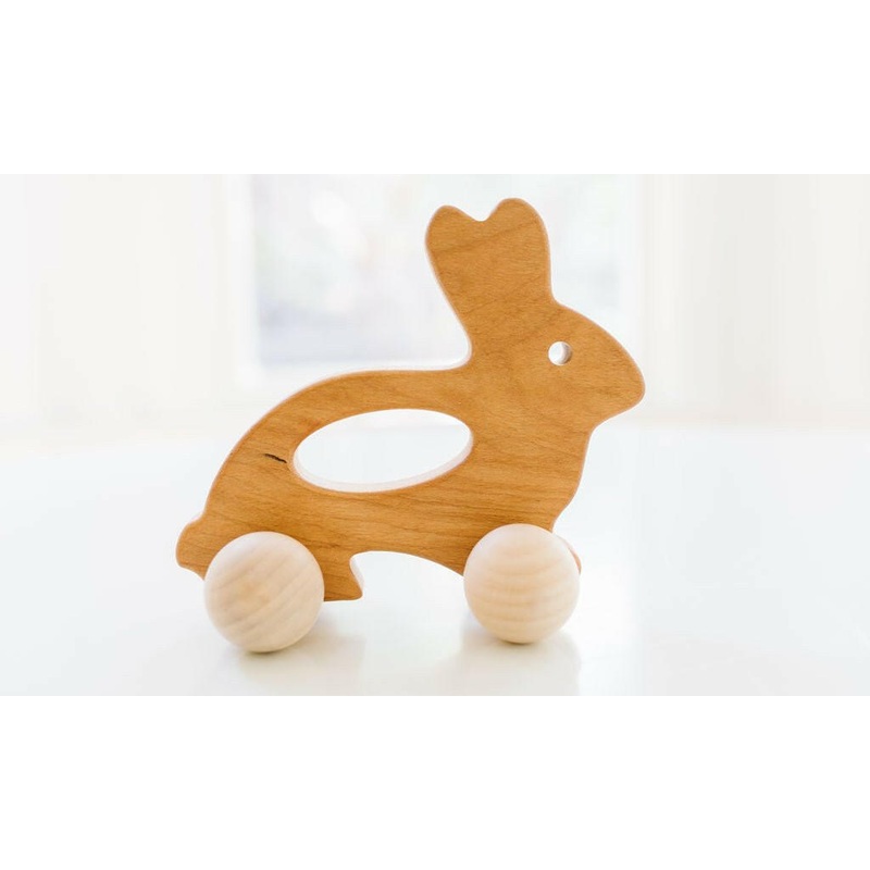 Encourage active play with our wooden push toy Bunny. Handmade in Iowa, it features an interior cutout that makes an easy "handle" for little fingers to grasp. Fun for babies and toddlers alike, this toy helps to develop motor skills and hand-eye coordinat