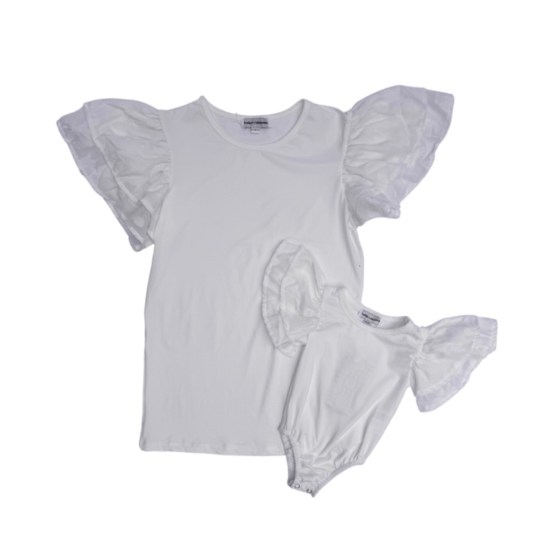 Your new favorite mommy and me top is HERE! With layered flutter sleeves, it's elegance meets flirtatious fun!Available in a leotard for month sizes, and top for toddler through adult, this sweet piece is comfortable and versatile!FIT:This item is running