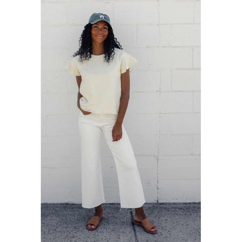 This charming top features raglan flutter sleeves with raw edges, a rounded neckline, and a stylish rolled hemline. Crafted from a stretchy knit fabric, it promises comfort and ease for all your summer festivities!// paired with the colman wide leg pants i
