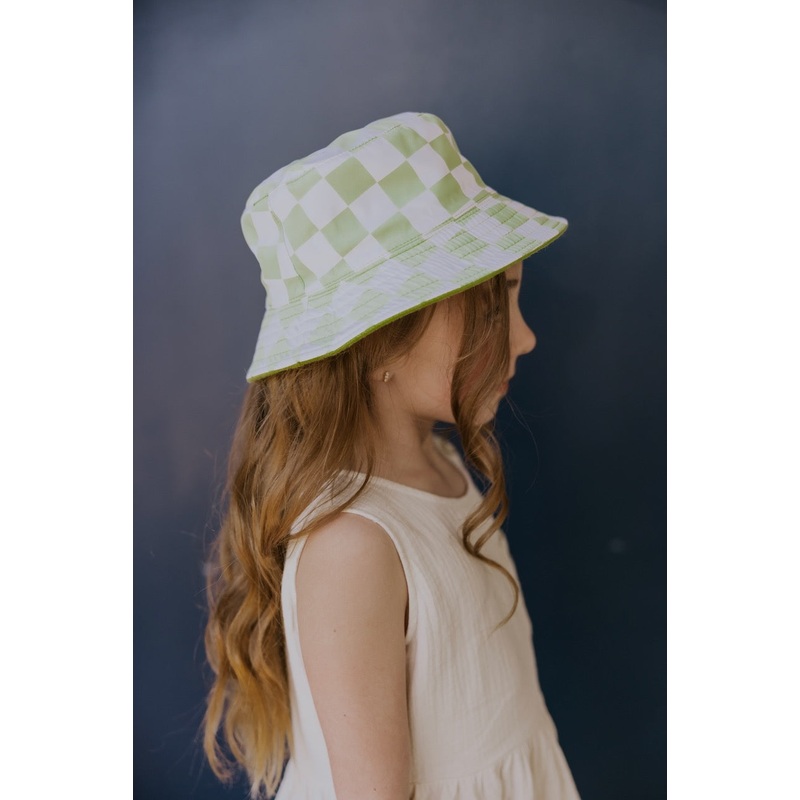 Checkered to solid. Solid to checkered. A reversible bucket hat for your little one is a summer MUST. Featured in brown + light green, this bucket hat is going to be perfect for summer trips to the zoo, park, + aquarium. Because this summer is all about fu
