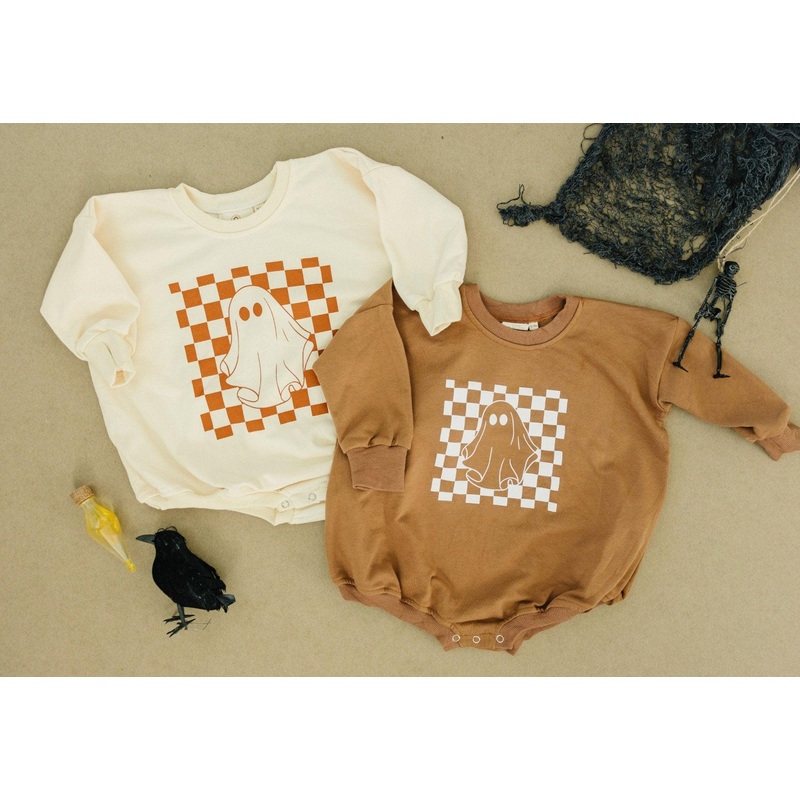 Retro ghost graphic oversized sweatshirt romper with snaps at crotch. Lightweight terry material.