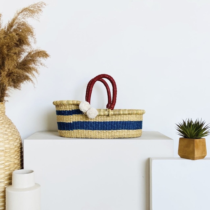 Perfect gift for the little mini in your life- Due to the handmade + hand dyed nature of this basket, color, pattern + leathermay slightly vary- Made in Ghana from elephant grass, chemical and fire retardant free. Dye from native plants.- This is a toy, no