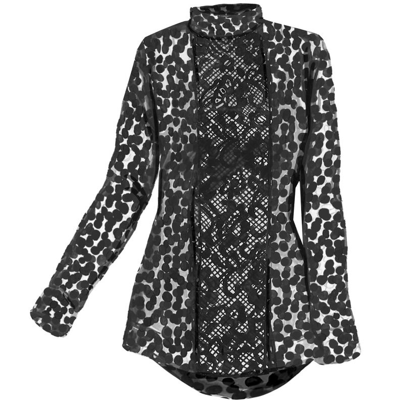 In order to make things perfectly clear, I recommend this unabashed Confidence Blouse (No. 5788) with its sheer silk chiffon bodice in thrilling black-and-white dot print. It not only allows you to display yourself in full coming-out-of-your-shell mode but may inspire others to do the same. Confidence, like mystery, attracts.