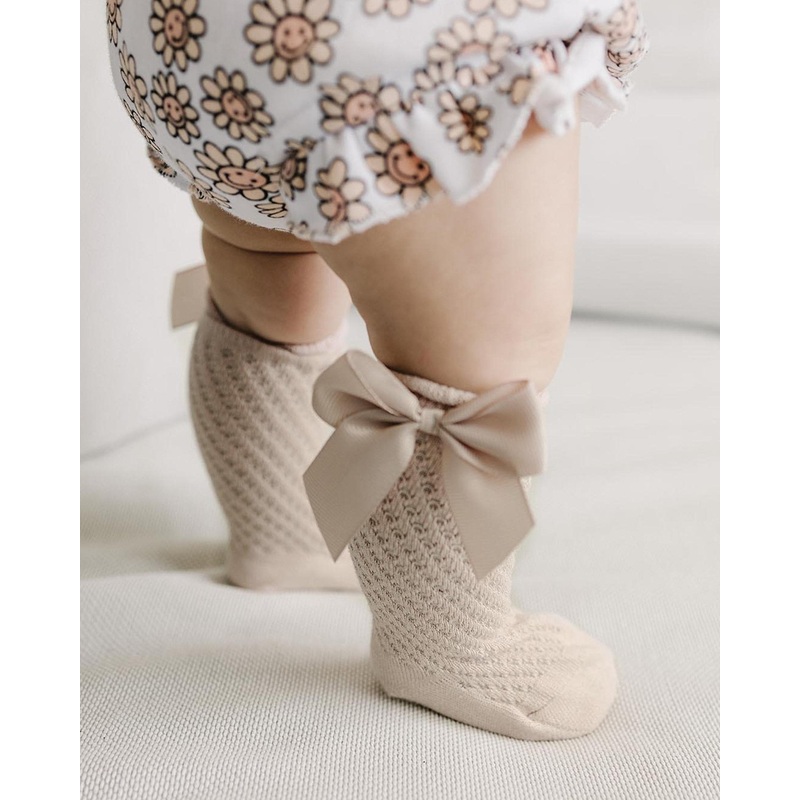 Compliment your little girl's outfit with these beautiful cotton lace knee high socks with bow detail! Perfect for family photos!80% cotton, 20% spandex