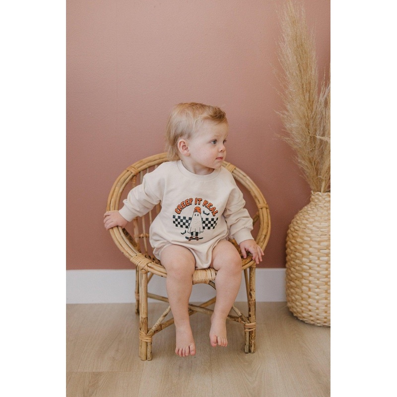 "Creep It Real" Halloween Graphic Sweatshirt Romper - Embrace the spooktacular vibe with this oversized sweatshirt romper. Complete with convenient snaps at the crotch, this romper ensures easy dressing and diaper changes. Crafted from lightweight French t