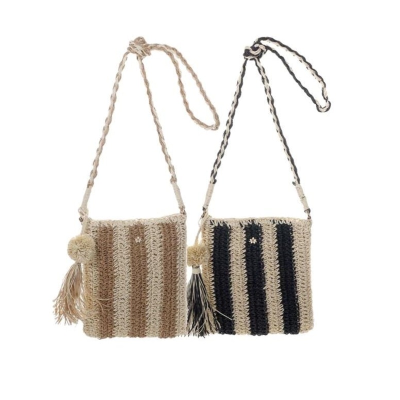 Hand-crocheted Toyo bags designed to turn heads. With braided handles, bold stripes, and a secure zip pocket, theyre perfect for making a statement on the go. Dimensions 8" W x 9" H.