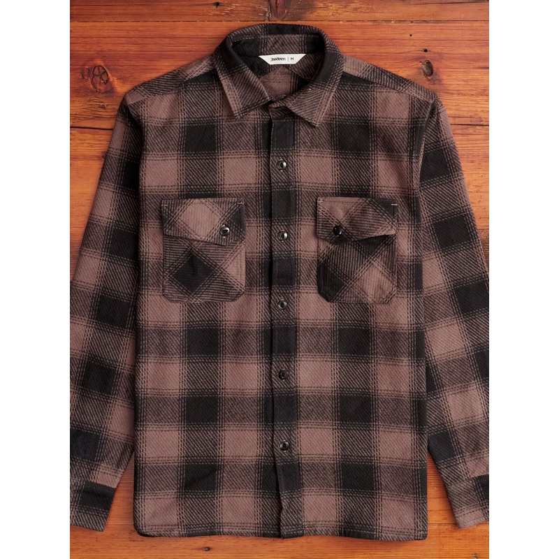 • 3sixteeen’s crosscut flannel is the brand’soriginal button-up shirt featuring custom woven fabrics and signature cross-stitched yoke at the back. Wovenwith thick gauge cotton yarn, this iteration features a custom weave cotton flannel fabric with aheavytexture and soft double-brushed interior. Cut in a regular fit with asymmetrical flap pockets and black fisheye metal buttons .