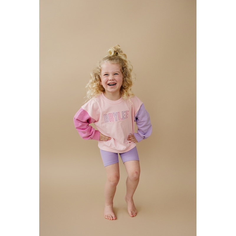 Model is wearing our bamboo bikers in the color "purple" (leggings are available in the same color)Custom embroidered crewneck sweatshirt or sweatshirt romper. French terry material, 83% cotton/17% polyester.Mix and match designs on any clothing item! (e.g