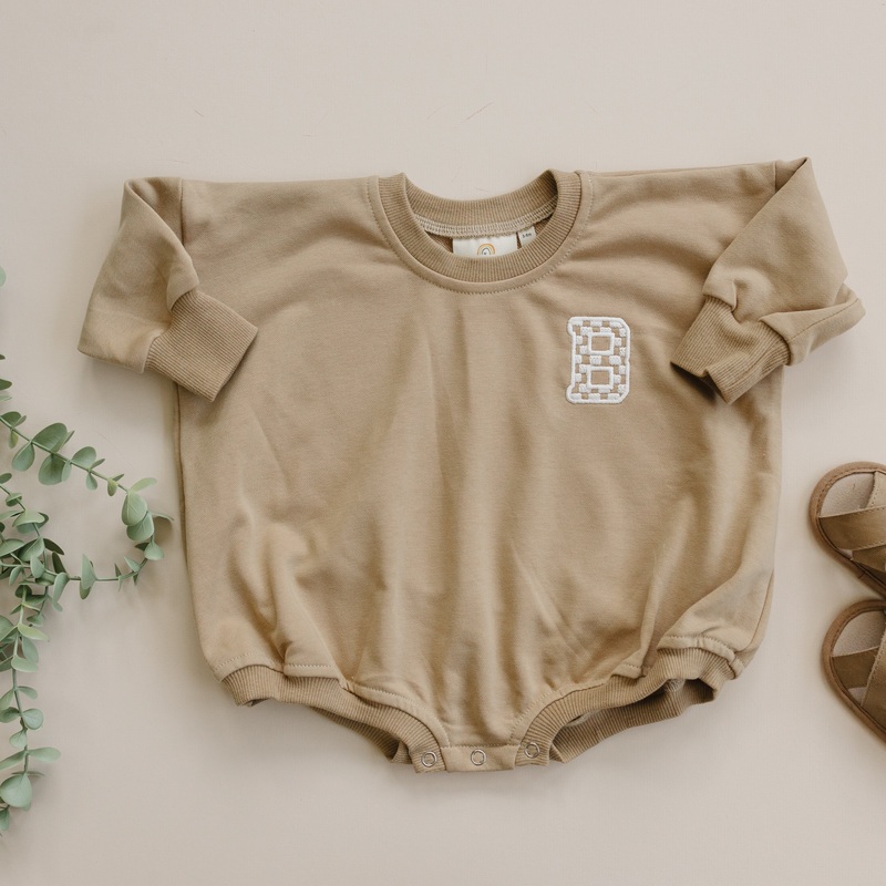 Custom embroidered sweatshirt romper. Lightweight French terry material, 83% cotton/17% polyester
