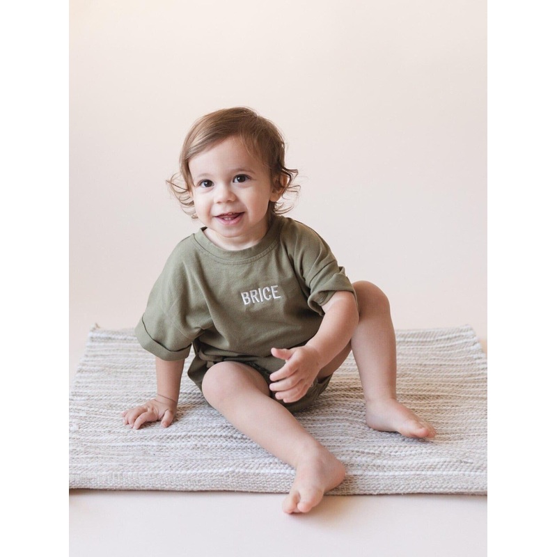 Oversized t-shirt romper with snaps at crotch. White and olive are 100% cotton, other colors are a super soft cotton blend (95% cotton, 5% spandex).
