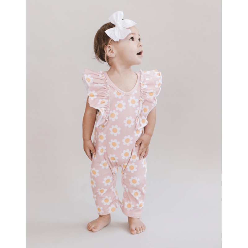 Extra sweet and comfy!This Daisy Flutter Jumpsuitfor baby girls is crafted to perfection with soft cotton fabric, making it both comfortable and stylish. This jumpsuit includes snap buttons along the bottom for easy changing, and a flutter ruffle along the